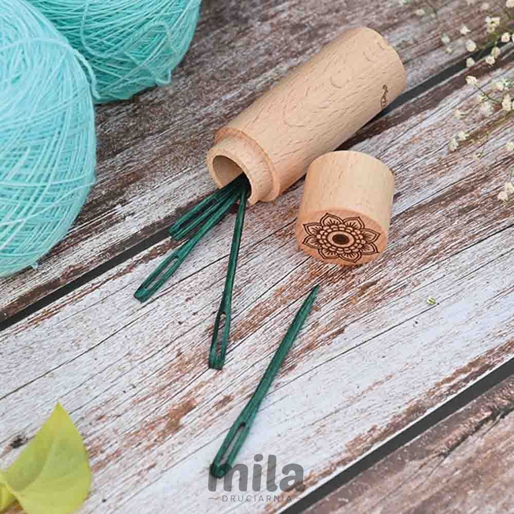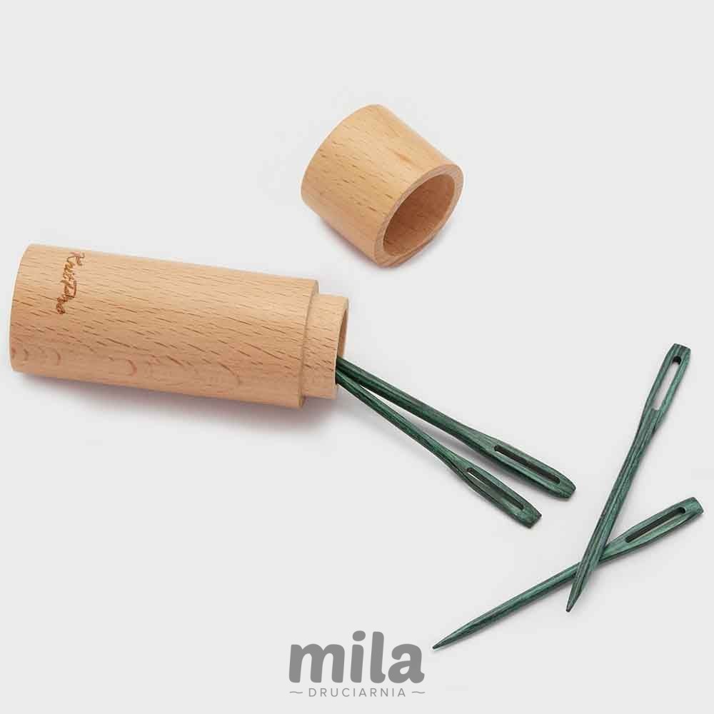 Igły wykonane są z drewna bukowego, zapakowane w cylindryczne, drewniane pudełko.