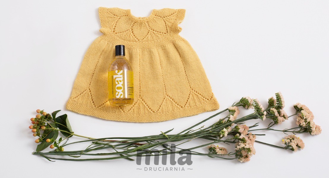 Do miski dodać płyn Soak - 5 ml/5 litry wody, napełnić miskę letnią wodą, do tak przygotowanej kąpieli włożyć praną dzianinę i moczyć ją minimum 15 minut. Delikatnie ugniatać.