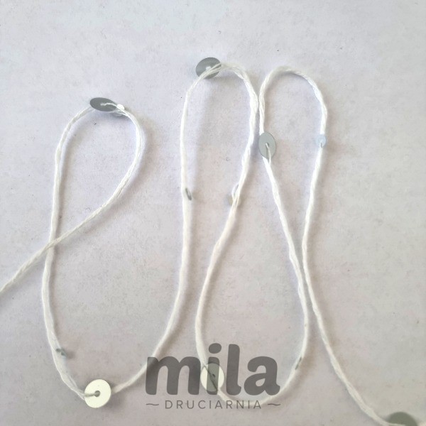Cekiny są równomiernie rozmieszczone na bawełnianej przędzy, mają rozmiar 3 i 6 mm, przędza bawełniana ma lekki skręt, cekiny lekko przesuwają się po nici, dzięki czemu możesz kontrolować w czasie dziergania, czy będą na lewej, czy prawej stronie dzianiny.