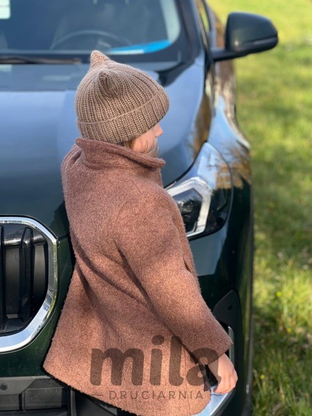 (gotowa czapka bez rozciągania ma obwód około 48 cm, wysokość po podwinięciu - około 23 cm)