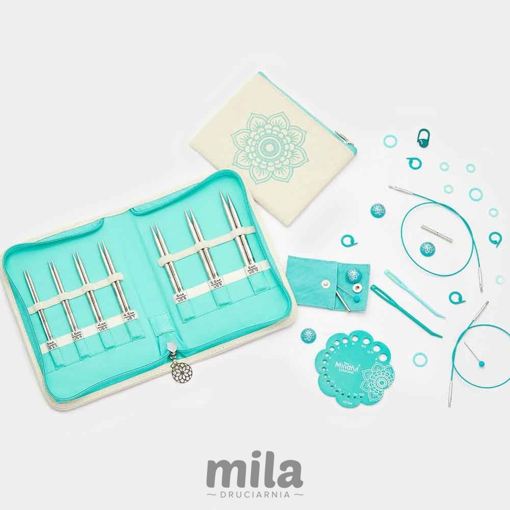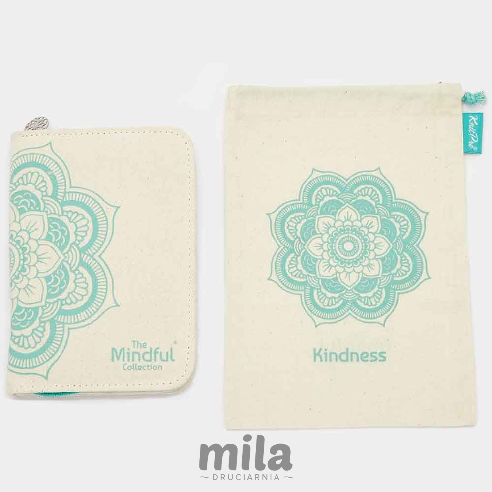 Druty zapakowane są w estetyczne płócienne etui, zamykane na zamek błyskawiczny. Kable w mnniejszym płóciennym etui, również na zamek. Akcesoria można przechowywać w oddzielnym małym etui zapinanym na zamek. Akcenty w kolorze turkusowym i symbol mandali w etui i akcesoriach są charakterystyczne dla kolekcji KnitPro Mindful.