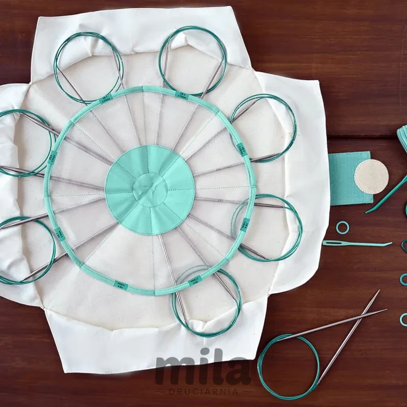 - Akcesoria: Miarka do drutów, markery i 2 igły dziewiarskie – wszystko w osobnej kieszeni.