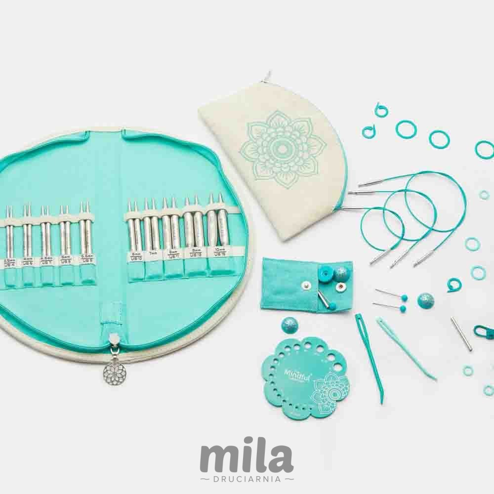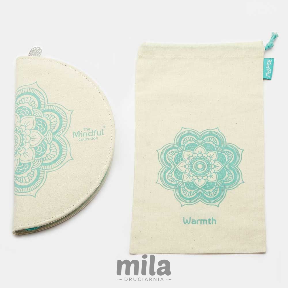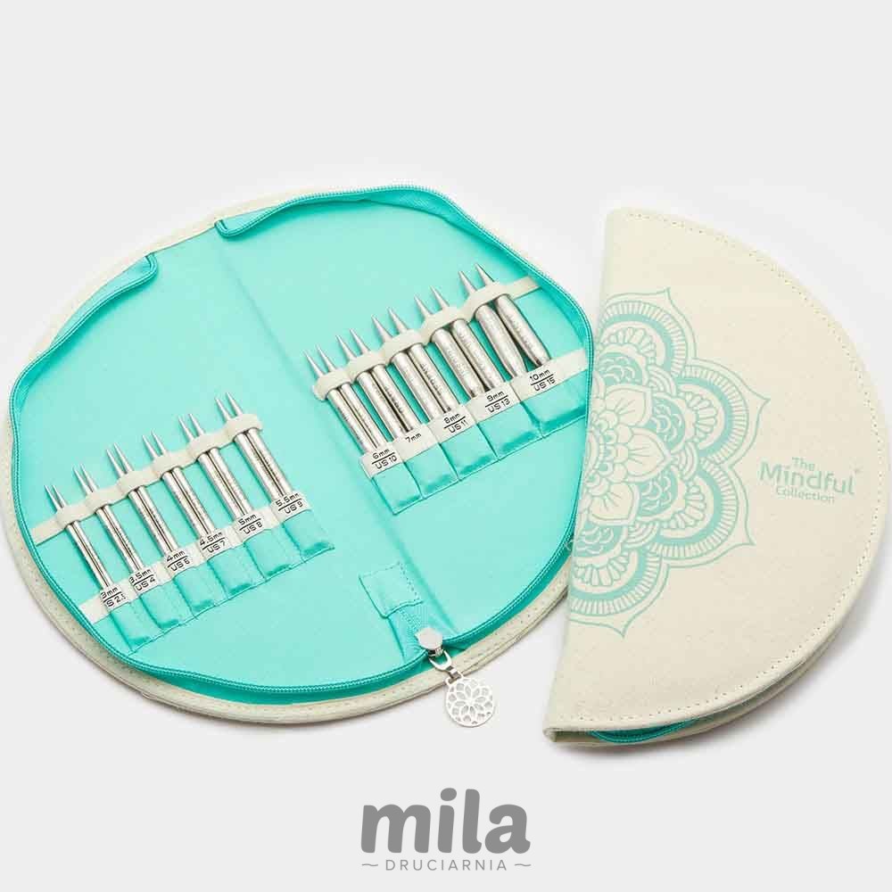 Druty zapakowane są w estetyczne płócienne etui, zamykane na zamek błyskawiczny. Kable w mnniejszym płóciennym etui, również na zamek. Akcesoria można przechowywać w oddzielnym małym etui zapinanym na zamek. Akcenty w kolorze turkusowym i symbol mandali w etui i akcesoriach są charakterystyczne dla kolekcji KnitPro Mindful.